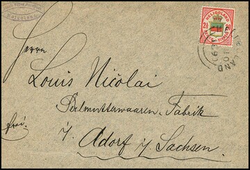 20 Pfg., letzte Auflage, etwas bestoßen durch Randklebung, auf Couvert vom vorletzten Tag, 9. Aug. 1890, nach Breslau und weitergesandt nach Berlin, rs. hübsches goldbronzenes Absender-Monogramm im Prägedruck, sign. Lemberger