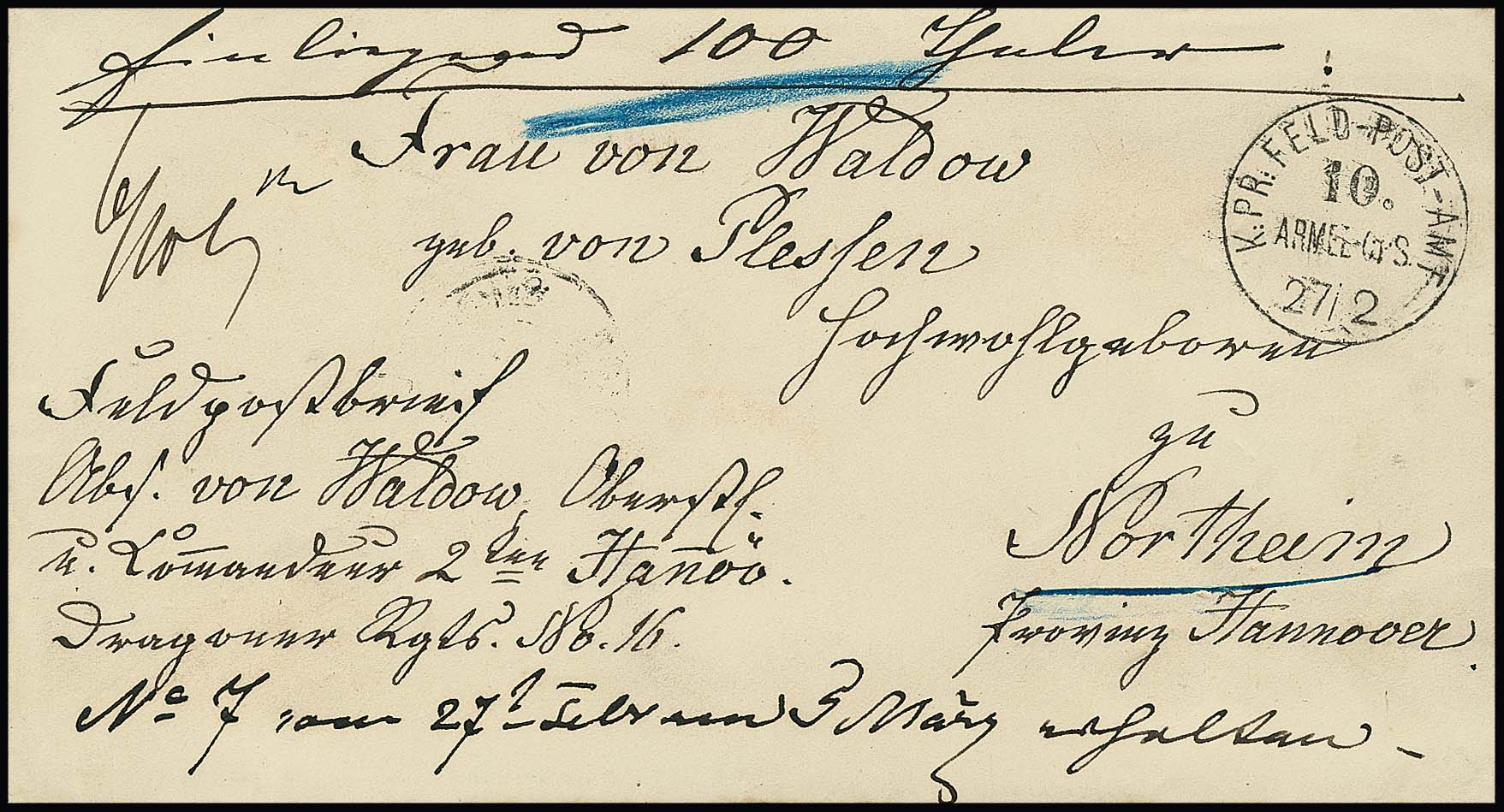 1871, K1 "K. Pr. Feld-Post-Amt 10. Armee-Cps." auf gesiegeltem Feldpost-Wertbrief nach Northeim
