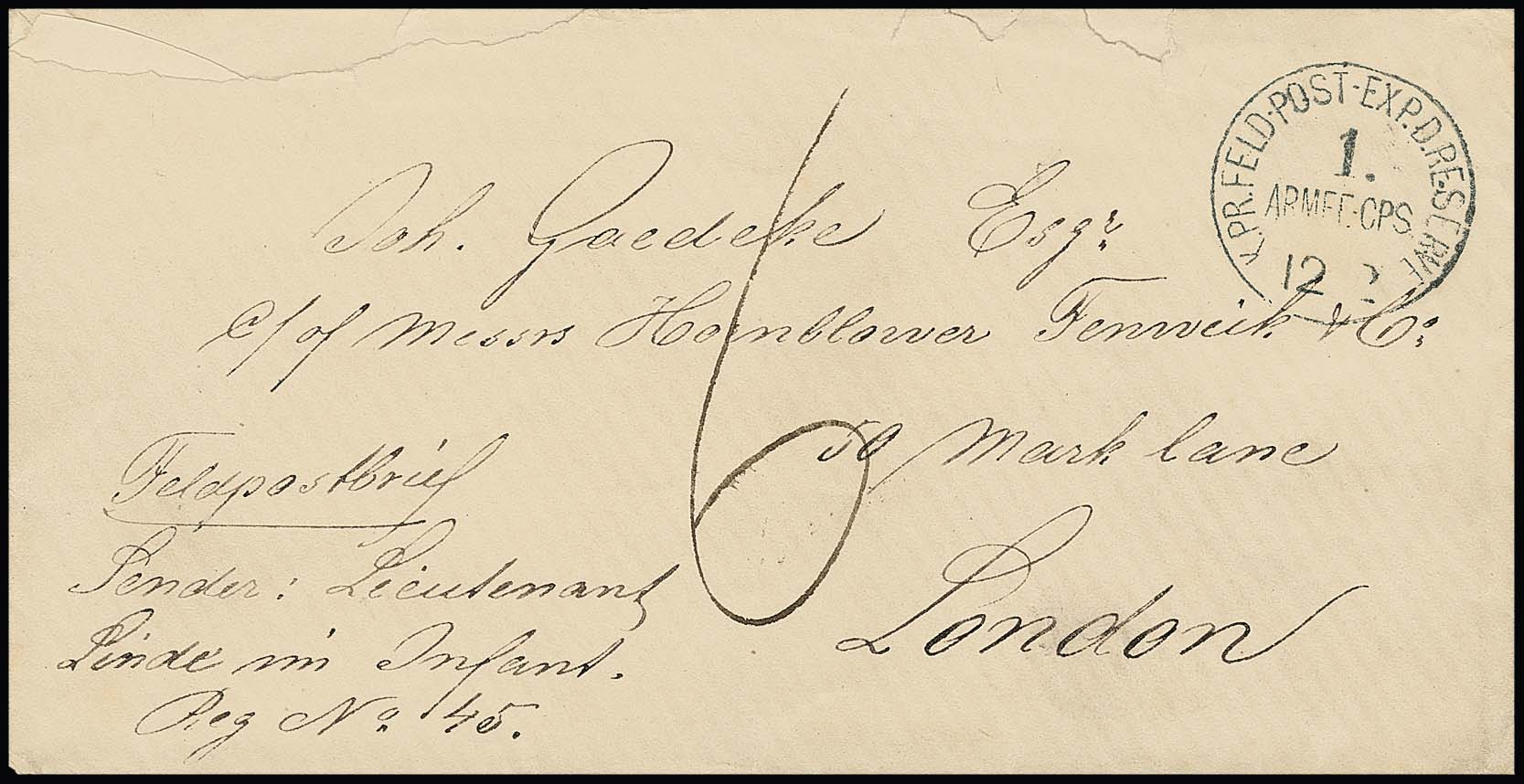1871, K1 "K. PR. FELDPOST-EXP. D. RESERVE-ARMEE-CPS.", 1. Arm.-C., auf seltenem nachtaxiertem Auslandsbrief nach London