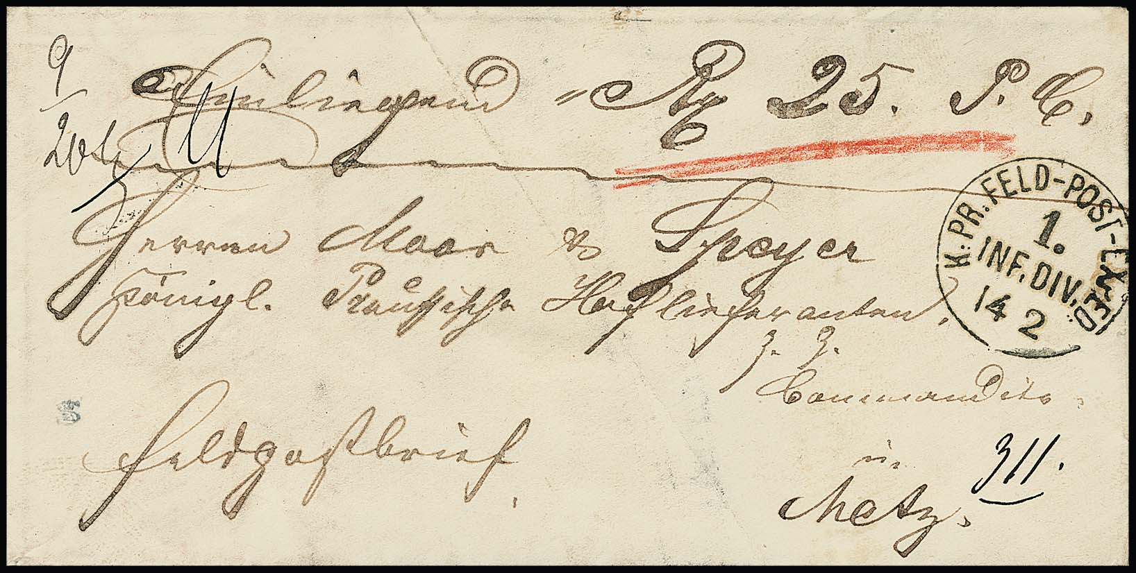 1871, 14.2., K1 "K. Pr. Feld-Post-Exped. 1. Inf. Div." klar auf gesiegeltem Feldpost-Wertbrief nach Metz