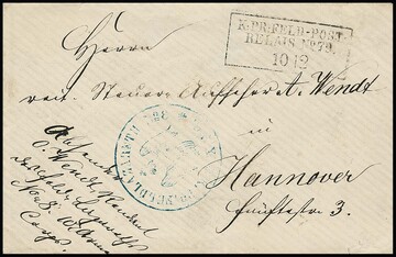 1870, Feldpostbrief, Couvert (rs. obere Klappe kl. Mgl.) mit Ra3 "K. Pr. Feld-Post-Relais No. 79" nach Hannover, blauer Lazarettstempel, dieses befand sich vom 29.11.1870 bis 28.2.1871 in Puisenaux, das Relais in Nemor, je südöstlich von Paris