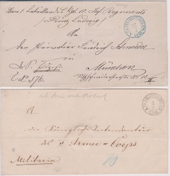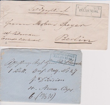 Feldpost, (1871), 3.2.,12.2., "K. PR. FELDPOST-RELAIS NO. 64", schwarzer und blauer K2 auf zwei Briefhüllen