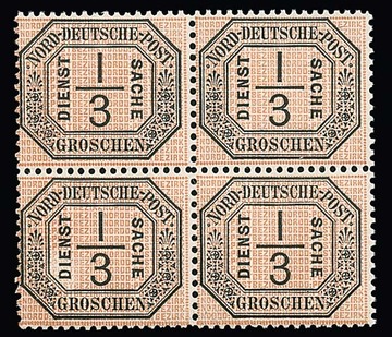 Dienstmarke 1/3 Gr. im postfrischem Luxus-Viererblock, Mi. ca. 230,- analog zur Einzelmarke, Einheiten sind dort in postfrischer Qualität nicht bewertet