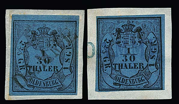 1/30 Th. schw./blau, je breitrandig, auf zwei Briefvs., auf Briefstück, ebenfalls gut gerandet auf Kabinettbrief aus Varel, sowie eng geschnitten auf Brief aus Oldenburg