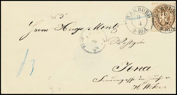 3 Sgr. ockerbraun auf interessantem Postwechselbrief, mit preußischem K2 "Hamburg" entwertet und dann der taxischen Post Hamburg (Neben-K1) übergeben nach Jena