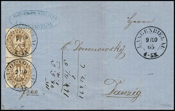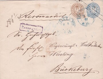 3 Sgr. ockerbraun auf Ganzsache 2 Sgr. blau im Großformat, als Einschreibebrief von Berlin nach Bückeburg