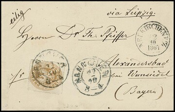 3 Sgr. braun auf kleinem Prachtcouvert mit schwarzem K2 "Hannover" nach Alexandersbad bei Wunsiedel, Taxis-K1 "Neukirchen B.Z.", 12.10.1867, sehr ungewöhnlicher Laufweg!
