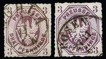 3 Pfge. rotviolett, zwei Exemplare mit untersch. Verwendungen, K2 "Posen" (etwas erh. sign. Flemming), sowie typische Taxis-Verwendung mit K1 "Ruhla" (Kabinett), Mi. 700,-