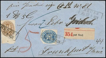 3 Sgr. braun, Kabinett-Unterrandstück (mit Anlagepunkt anstatt Randnummer) nebst defekter 2 Sgr. ultramarin auf Paketbrief mit Ra2 "Neuss" nach Frankfurt (Empfängername überschrieben)
