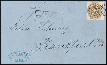 3 Sgr. erdbraun auf zwei Briefen (einer ohne Seitenklappen) 1865/66 aus Coeln. Einmal aptierter Bahnpost-Ra3 "Coeln Eisenb. Post-Bureau" als Markenentwertung (selten), einmal nebengesetzt und Marke mit Zug-L3 "Coeln-Mainz" entwertet. Mi. 300,-