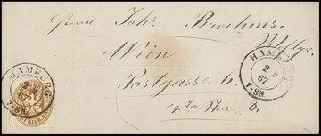 3 Sgr. ockerbraun auf Damencouvert (dieses mittig unten Einriß) von Hamburg 1867 an den bekannten Komponisten Johannes Brahms (1833-1897) in Wien