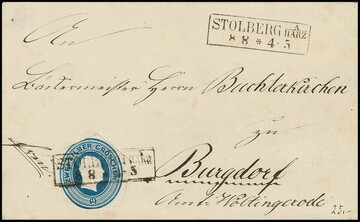 Kopf-Ganzsachen-Ausschnitt 2 Sgr. blau, kurios sechseckig geschnitten, auf Brief mit Ra2 "Stolberg a. Harz"