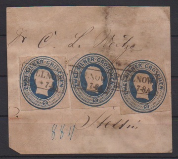 Kopf-Ganzsachen-Ausschnitt 2 Sgr. blau, drei viereckig geschnittene Exemplare auf halbem Wertbrief (unfrisch bzw. fleckig) mit Ra2 "Pollnow", seltene Kombination. Mi. 750,- +