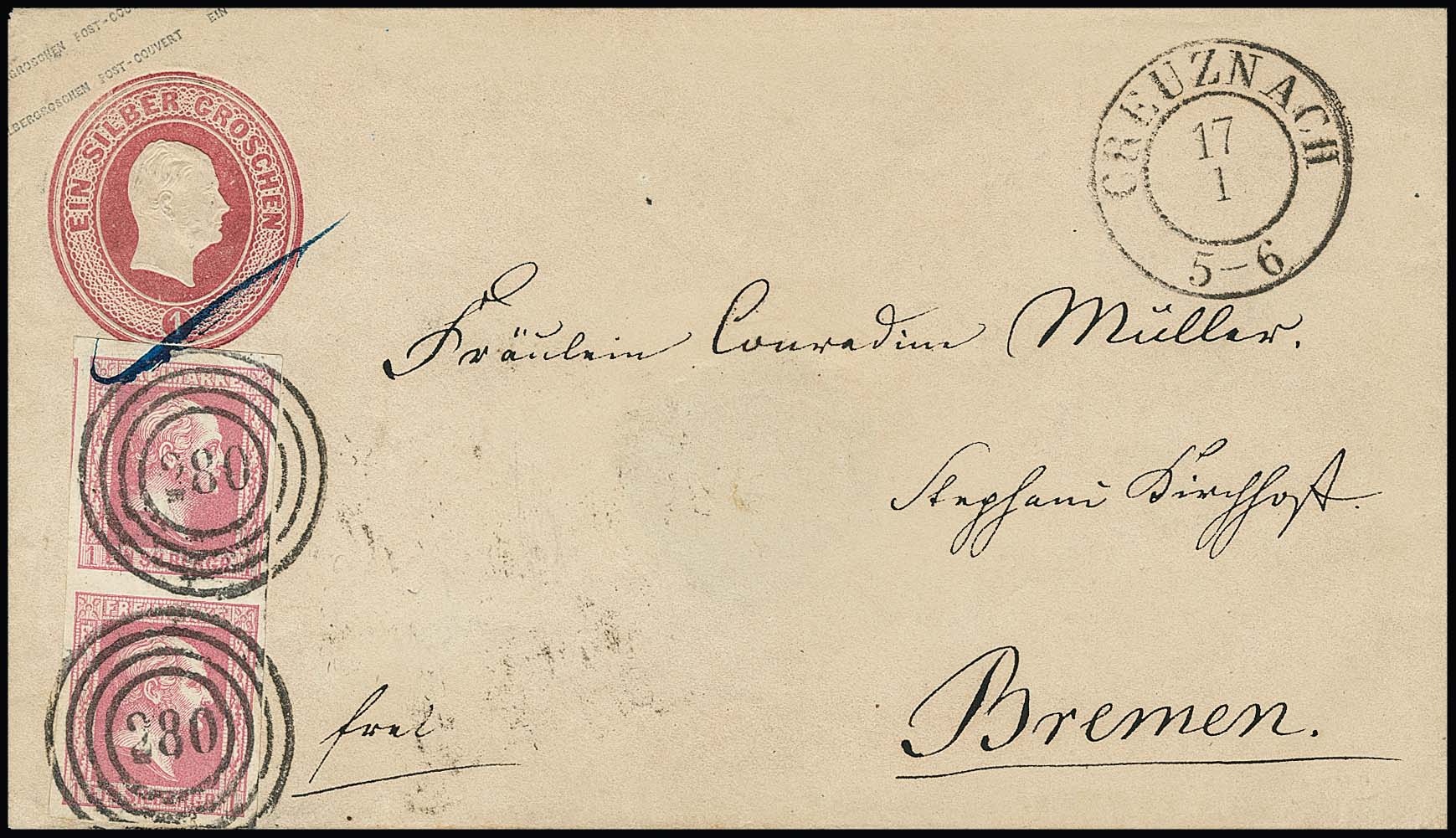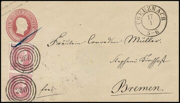 1 Sgr. karmin, breitrandiges Paar auf Ganzsache 1 Sgr. rosa (rs. Siegel ausgeschnitten), mit NS "280" und K2 "Creuznach" nach Bremen