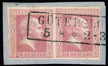 1 Sgr. rosa, perfekt gerandetes Paar auf Briefstück mit Ra2 "Gütersloh", rechte Marke winzige Faserstelle im Rand, deutliche Abart "vertikale Klischee-Verschiebung" (Handbuch A1)