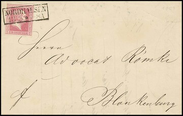 1 Sgr. karmin, 2 Sgr. preußischblau (sign. Brettl), zwei Kabinettbriefe je mit Ra2 "Nordhausen"