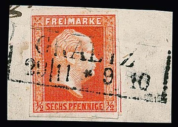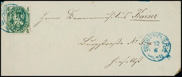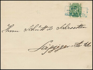 Wappen, sechs Belege, dabei Nr. 14a auf Streifband, 15a auf Ganzsache U26A (Wertbrief), zwei Briefe Nr. 16 aus gleicher Korrespondenz (blauer bzw. schwarzer K2 "Hannover" und je 2 Pfg. Botenlohn), Brief 1 und 2 Sgr., sowie Auslandsbrief mit Paar 2 Sgr. blau in die Schweiz