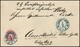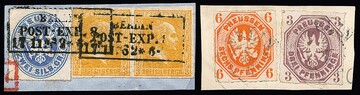 Zwei Briefstücke mit ungewöhnlichen Kombinationen aus Berlin: Paar 3 Sgr. gelborange (Kopf, linke Marke etwas berührt) nebst Wappen 2 Sgr. blau, sowie 6 Pfge. orange und 3 Pfge. purpur