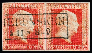 1/2 Sgr. ziegelrot, gut gerandetes Paar mit besserem Ra2 "Mierunsken", re. Marke unauffälliger verklebter Spalt, Attest Wasels. Mi. 450,-