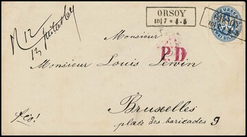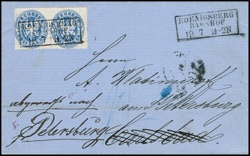 2 Sgr. blau im Kabinettpaar auf Faltbrief mit Ra3 "Koenigsberg Bahnhof", erst nach Carlsbad in Böhmen und von dort weiter nach St. Petersburg mit rs. Ankunftsstempel, 1863. Interessantes Portorätsel
