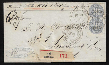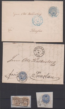 1 Sgr. rosa per vier (dabei Dreierstreifen) auf Einschreibebrief mit blauem Ra3 "Berlin Post-Exp. 8", ferner 1 und Paar 2 Sgr. auf Auslandsbrief von Cöln Bahnhof nach Genf, sowie 2 Sgr. hellblau per zwei auf Paketbrief aus Sprottau