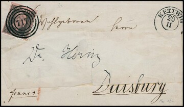 "717" nebst K2 "Kettwig" klar 1857 auf Brief 3 Sgr. (kl. Vortrennschnitt)