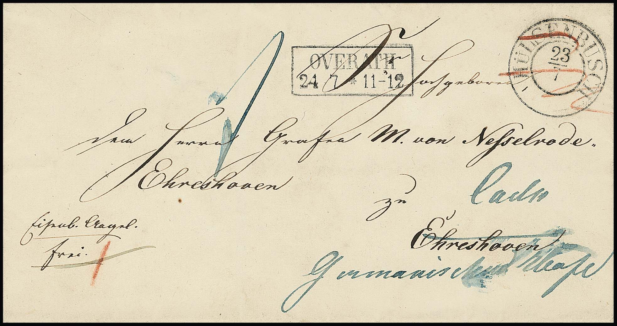 "Overath", 1834, seltener K1 auf Luxus-Paketbegleitbrief nach Düsseldorf, ferner Ra2 1853, nebst K2 "Hülsenbusch", auf dekor. Nachsendebrief