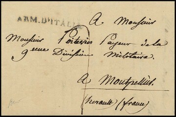 "Oletzko" (Marggrabowa)/Ostpreußen, 1812, kleiner Soldatenbrief mit klarem L1 "ARM. D` ITALIE" nach Montpellier, interessanter, zweiseitiger Inhalt (französ.), Bericht vom Marsch nach Moskau über Tilsit, Belege der "Armee d` Italie" vom Rußlandfeldzug sind allergrößte Seltenheiten, sign. Baudot