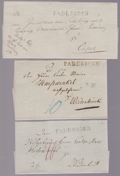"Paderborn", (1810), je L1 auf 11 Briefen, meist mit hs. Franchise, auch L1 "HDS", etc.
