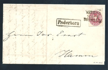 "Paderborn", Stations-Ra1 nebst Zug-L3 "Warburg-Düsseldorf" auf Prachtbrief 1 Sgr.
