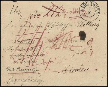 "Paderborn", (1850), K2 auf interessantem Retour-Postvorschußbrief nach Minden, "Mit Recipisse, Eigenhändig", viele Taxen