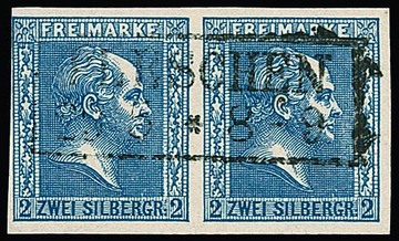 "Pleschen", Ra2 voll auf Prachtpaar 2 Sgr. dunkelblau (Mi. 160,-, eine Marke natürliche Papierpore, gut sign. Flemming)