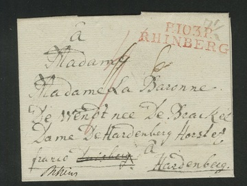 "Rheinberg", (1810), klarer roter L2 "P.103.P. RHINBERG" auf Brief (Laufweg "franco Duisburg" hs. geändert in "Rhein")