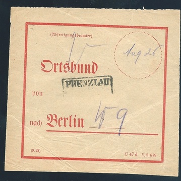 "Prenzlau", alter preuß. Ra2 ohne Datum auf Ortsbundzettel (1926)