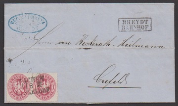 "Rheydt Bahnhof", Stations-Ra2 als Aufgabestempel, Marken mit Zug-L3 "Aachen-Düsseldrf." entwertet, auf Faltbrief mit Paar 1 Sgr., sign. Banker