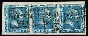 "Reichenb.-Liegnitz Eis. Post-Bureau No. 14", besserer Bahnpost-Ra3 klar auf Dreierstreifen 2 Sgr. tiefblau (fast "b"), linke Marke min. Beanst., Fotoexp. Brettl. Mi. 500,-
