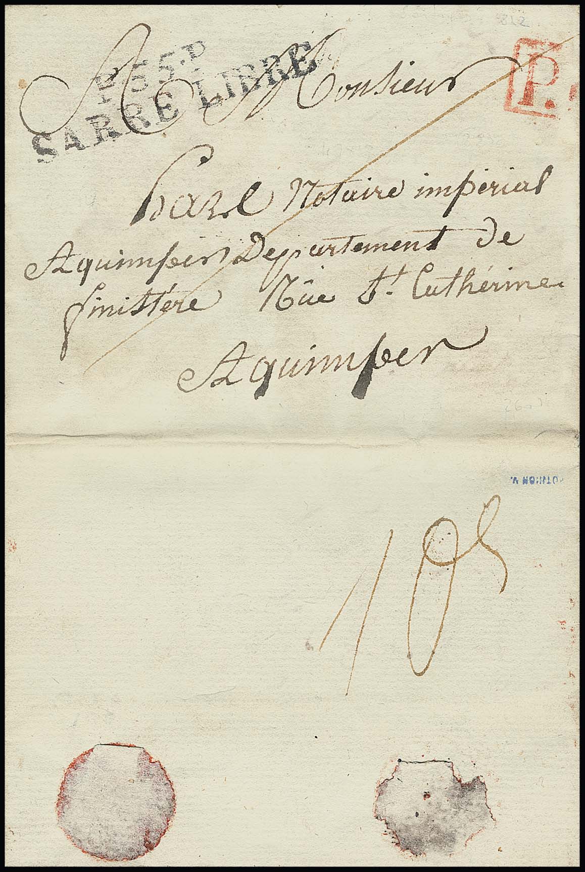 "Saarlouis", 1812, schwarzer L2 "P.55.P. SARRE LIBRE" auf Brief mit Inhalt nach Quimper. Sign. Pothion, Feuser 3064-10/400,-