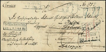 "Ruschendorf", 1859, seltener Westpreußen-K2 auf seltenem "Circulair"-Brief mit vom Absender rückseitig vorgegebener 10-facher Nachsendung, dadurch vorderseitig acht versch. Aufgabe-Stempel, so sehr ungewöhnlich und wohl Unikum. Sign. Kruschel