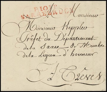 "Saarbrücken", 1803/8, zwei Briefe mit rotem L2 "P.101.P. SARREBRUCK" (R!) bzw. "101 SARREBRUCK", Feuser 3062-4, -5/330,-