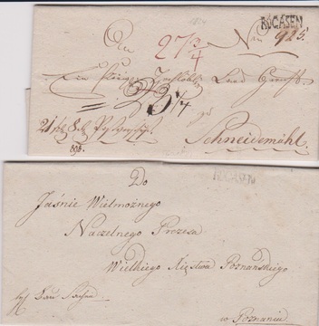 "Rogasen", 1821/24, besserer Postwärter-L1 klar auf zwei Briefen mit Inhalt