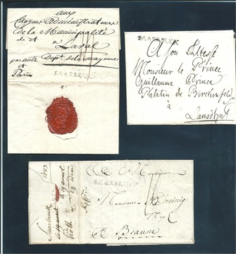 "Saarbrücken", 1803/6/7, roter (2) bzw. schwarzer L2 "101 SARREBRUCK" auf drei Briefen mit Inhalt (u.a. aus Sulzbach), Feuser 3062-4