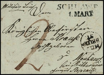 "Schlawe", 1839, großer L2 auf kleinem "Militär-Brief" nach Neuhaus bei Stepenitz/Pommern, vs. K1 "MIL. BRIEF-ST."