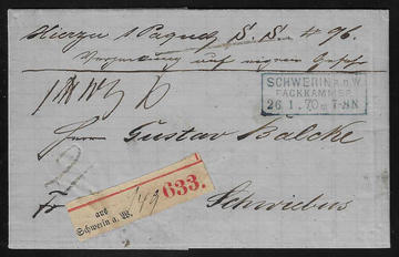 "Schwerin a.d.W. Packkammer", seltener blauer (!) Grotesk-Aufgabe-Ra3 vorderseitig, die rs. 2 Gr. NDP (leichter Schatten) mit nachverw. schwarzen Antiqua-Ra3 "Schwerin a.d. Warthe" entwertet, auf Paketbegleitbrief