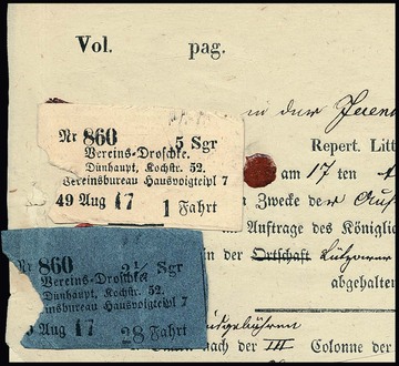 "Berlin", "Vereins-Droschke Dünhaupt, Kochstr.", zwei seltene kleine Quittungs-Etiketten über 5 und 2 1/2 Sgr. auf Unterlage