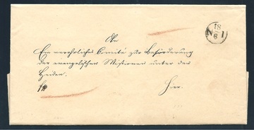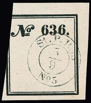 "ST.P.R. 15 No. 5", K2 des Stadtpostreviers auf Quittungsmarke "No. 636" (links angeschnitten). Für jeden bei einem Stadt-Postrevier abgegebenen Brief erhielt der Einlieferer eine Quittungsmarke mit dem Stempel des Reviers. Der gleiche Stempel wurde bei Ortsbriefen auf die Vorderseite, bei Fernbriefen auf die Siegelseite gestempelt. Fernbriefe erhielten im Haupt-Postamt auf der Vorderseite einen Stempel