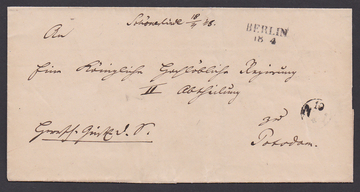 "Berlin", 1848, L2 in ungewöhnlicher Kombination mit handschriftlicher Briefsammlungs-Aufgabe "Schönerlinde 18/4 48" auf Brief nach Potsdam