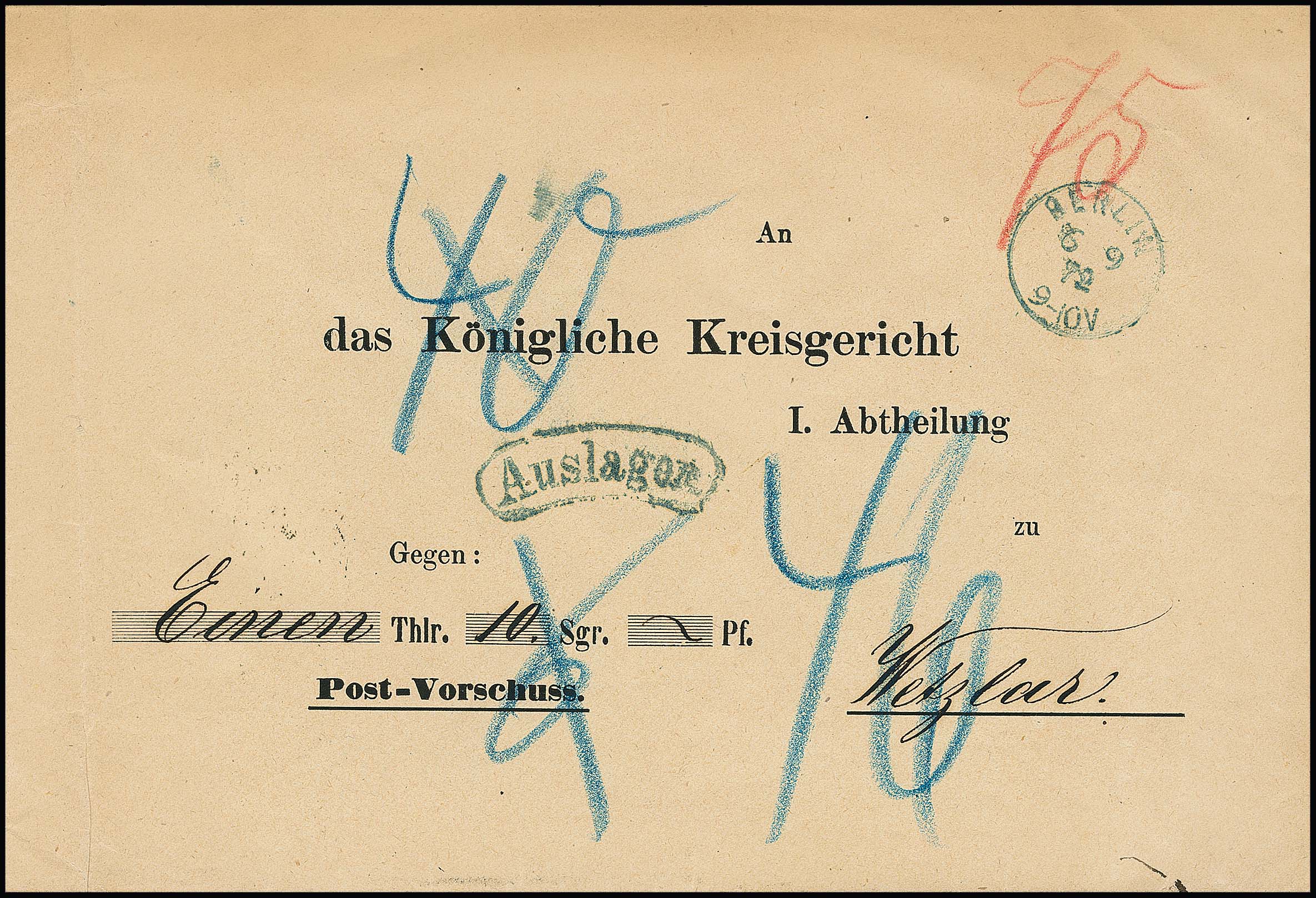 "Berlin", 1867/72, blauer K1 des Hofpostamtes auf zwei Postvorschuß-Vordruckbriefen, KHBW 8a, zur Zeit des Deutschen Reiches bisher unbekannt (nur bis 7.12.71 gelistet)