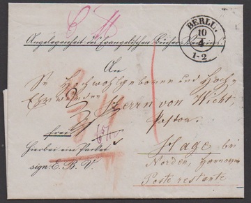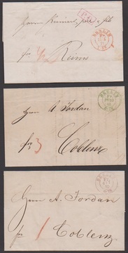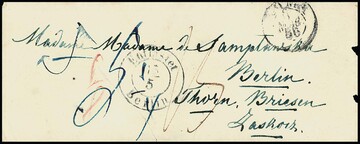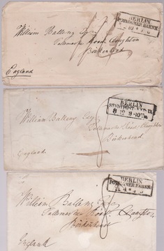 "Berlin", ca. 1854-61, 46 Briefe aus einer Korrespondenz nach England (wenige Briefe Papiermängel), versch. Stempel (Stadtpost-Exp., Anhalter und Potsdamer Bahnhof), versch. Laufwege, Doppelporto etc., interessantes Studienobjekt