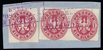 "Berlin Post-Exp. 8", seltener violetter Ra3 auf Kabinettbriefstück mit Paar und Einzelstück 1 Sgr. karmin