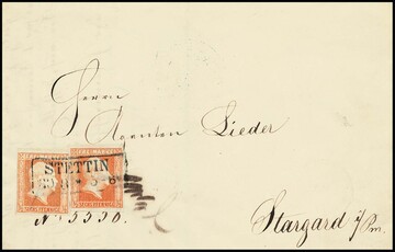 1/2 Sgr. ziegelrot per zwei (gelöst und replatziert) auf Prachtbrief von Stettin (Ra2) nach Stargard